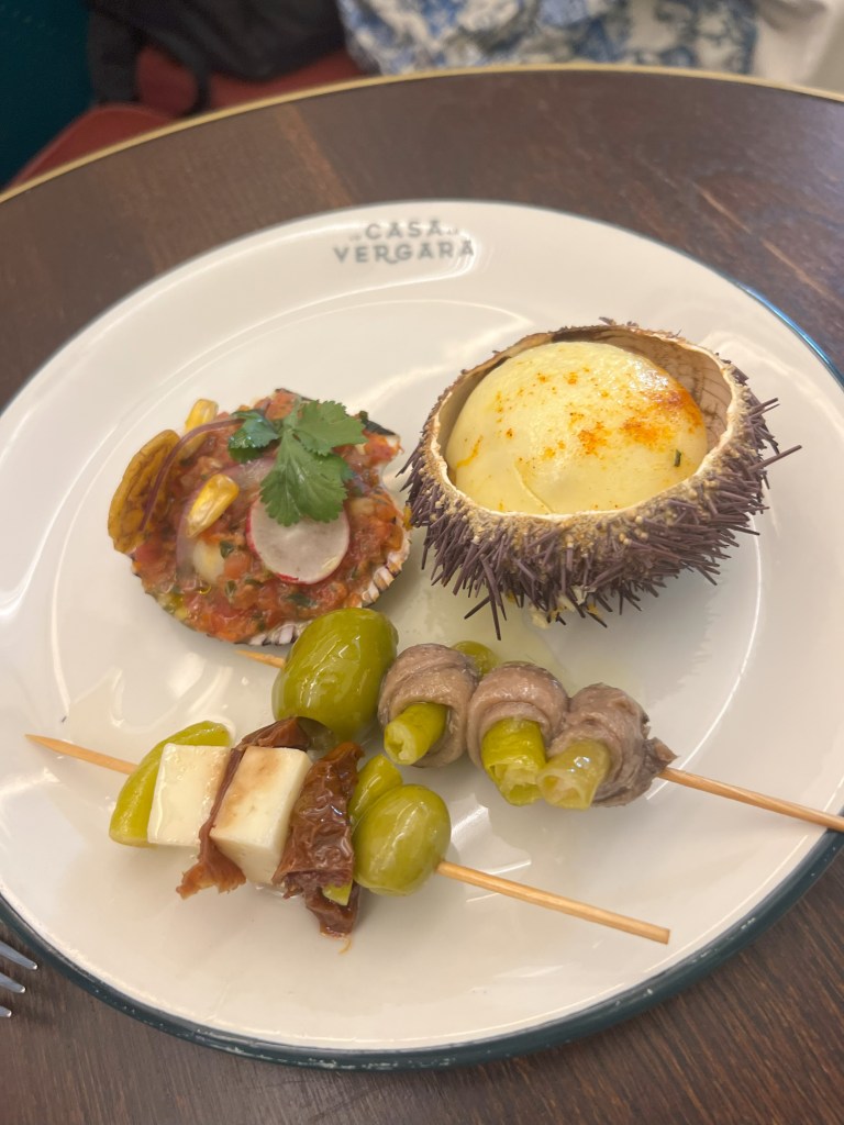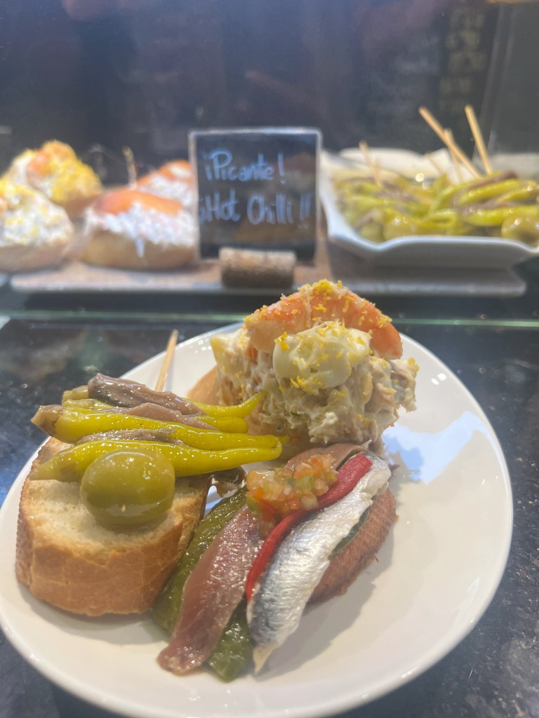 San Sebastian’s food scene can be split into three categories – Michelin Starred fine dining, relaxed seated restaurants and pintxos bars. My favourite by far was the pintxos bars. These are tiny bars where you can order a drink and a couple of small plates – a “pintxo” is a small snack typically served on bread – then move to the next bar. Some bars are so small they don’t even have seats or you can just stand outside. The bars here have speciality dishes and it’s worth checking out the prize winning dishes at each bar. Wash it down with a glass of Txakoli – a slightly sparkling white local wine which is served from a height.
